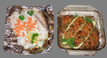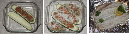 It is a little tricky to time this but the the Zucchini will be done in about 45 minutes.  Then you keep it warm with an aluminum foil cover while you cook the fish. In the toaster-oven the fish cook best when baked for 10 then top broiled for 5 min. Check the fish for flaky soft with a fork, no pink. Garnishh with parsley if you have it, a slice of lemon and sprinkle some marinated Papaya on the fish for serving.