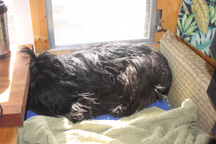 About 10:30 P.M the wind was strong and I needed to barricade the bottom of the door with some rugs and hang a beach towel from the upper casement to keep the cold air from blowing inside. My stocking feet were ice cold, our heater was puffing along and Miss Minna began to snuggle against me away from the window slats.