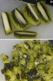 Select a soft Kiwi fruit: not squishy, firm but soft. Skin the fruit with a potato peeler. Cut in slices like orange wedges. Then chop them in 1/4 inch pieces. There is a white core. I chop that right up with the rest of the fruit.