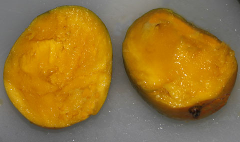 Halved mango (left without seed), right half (seed still present in fruit)…just go for it.