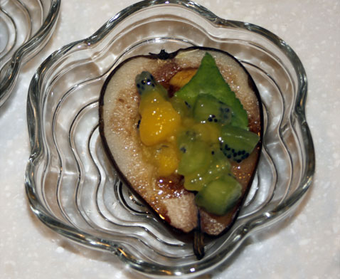 Just prior to serving place a small section of a basil leaf cut to look like  a small leaf, directly on top of the fruit in the cavity with the point hanging out over the pear meat. On top of this place about a teaspoon of refrigerated fruit mix saved in the mixing bowl. VOILA!