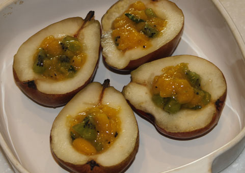 Serve warm stuffed pears with refrigerator cold fruit on top.