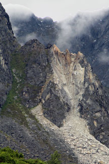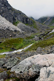The sky rolls by in gray, misty clouds huddling tightly around craggy peaks like puffy white wreaths encircling Santa’s cap. The rain drizzles down spattering leaves and stream surfaces, turning paths to sandy mud where a misstep can sink ankle-deep in thawed permafrost.