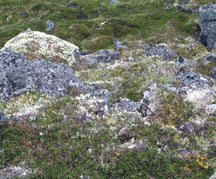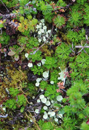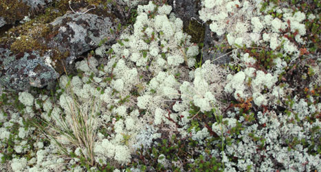 Reindeer lichen (Cladina rangiferina) decorates rock tops like toupees.