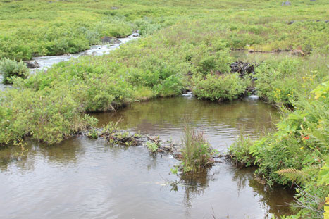 From the road edge down to the canyon floor, one feels like Fred Astaire dancing with the grace of a gazelle, gliding down a long, curving movie staircase. Flowing briskly at the bottom are the crisp clear waters of a mountain stream. A bank lined with plants like milkweed and thistle; peppered with a mixed packet of short and tall wildflowers, small dells of cotton grass decorate bog surfaces along with lower growing, almost ripe, wild blueberries. Large mushrooms break through in brown or tan or yellow-red, providing shady spots for elves and leprechauns of the north to rest.